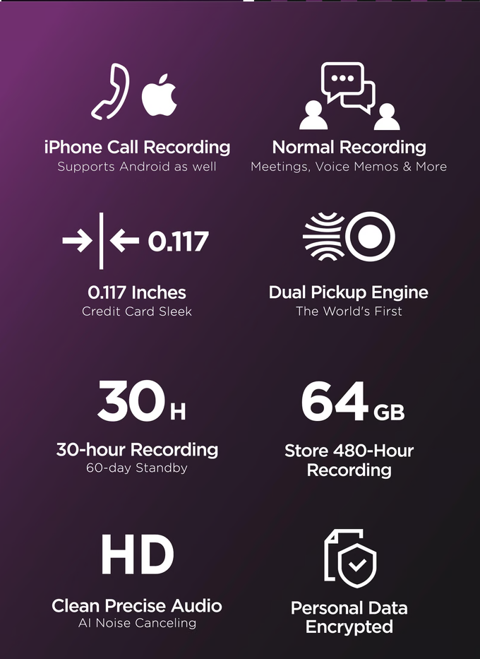 One-Press Recording|Transcription & Summary|Powered by ChatGPT|30-Hour Continuous Recording|64GB Storage|Snap with MagSafe|Free App